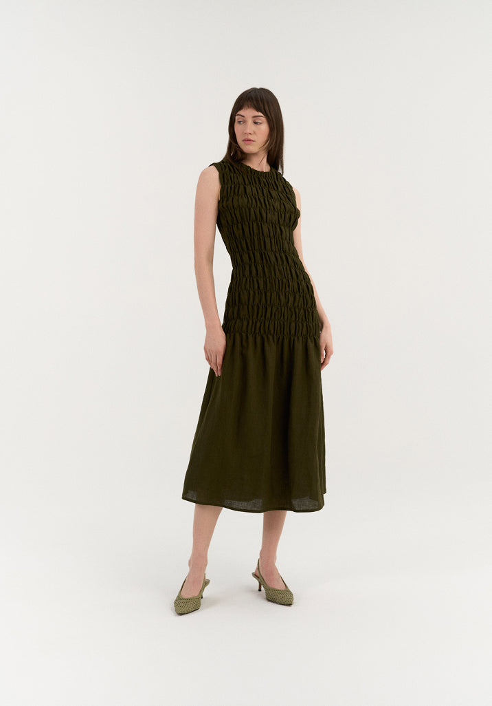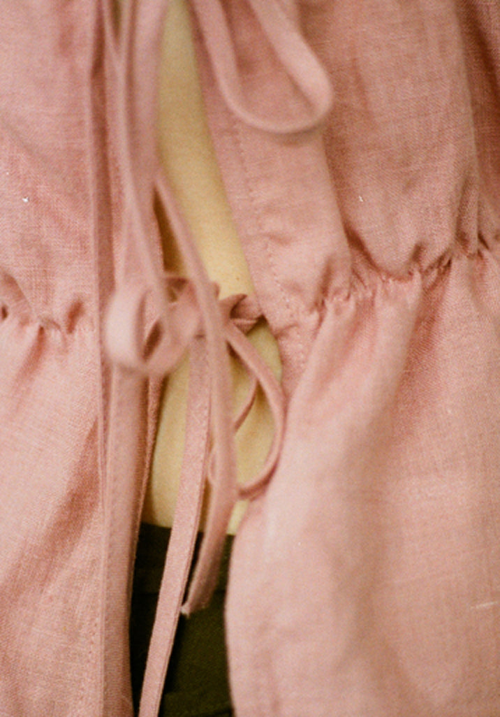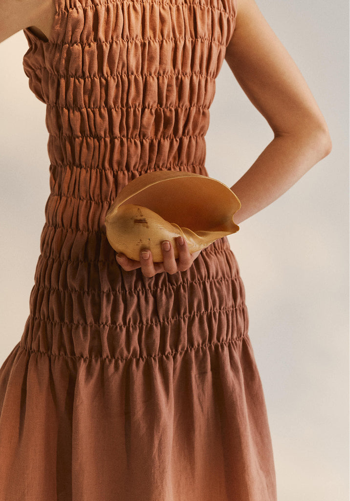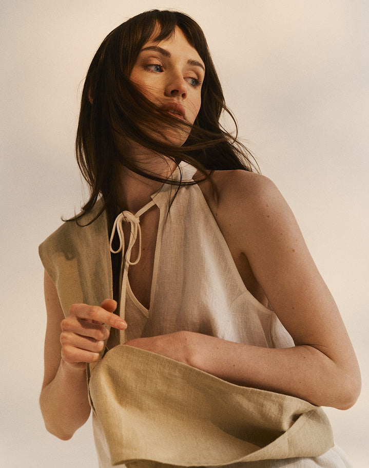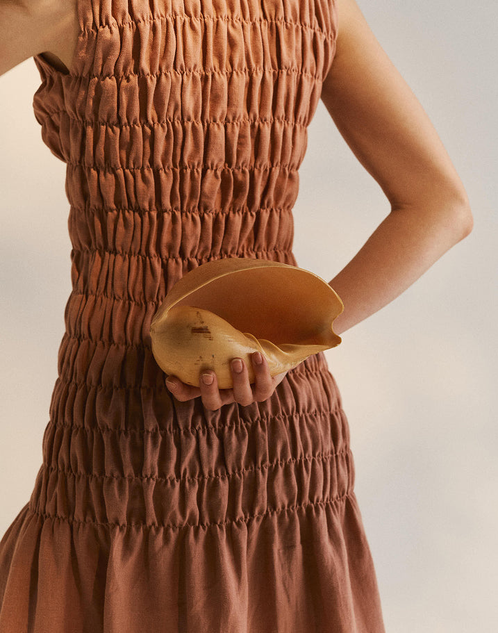 Die Details folgen derselben Logik: geraffter Stoff, der Muschelrippen und Meereswellen nachahmt, Perlmuttknöpfe, die das Licht einfangen wie etwas am Strand Gefundenes, Bänder und offene Rücken, die handgemacht wirken, leicht gelöst. Silhouetten sind klar, aber nie starr. Weiche Falten, fließende Formen, Leinen, das sich mit dem Körper bewegt und mühelos zur Ruhe kommt.