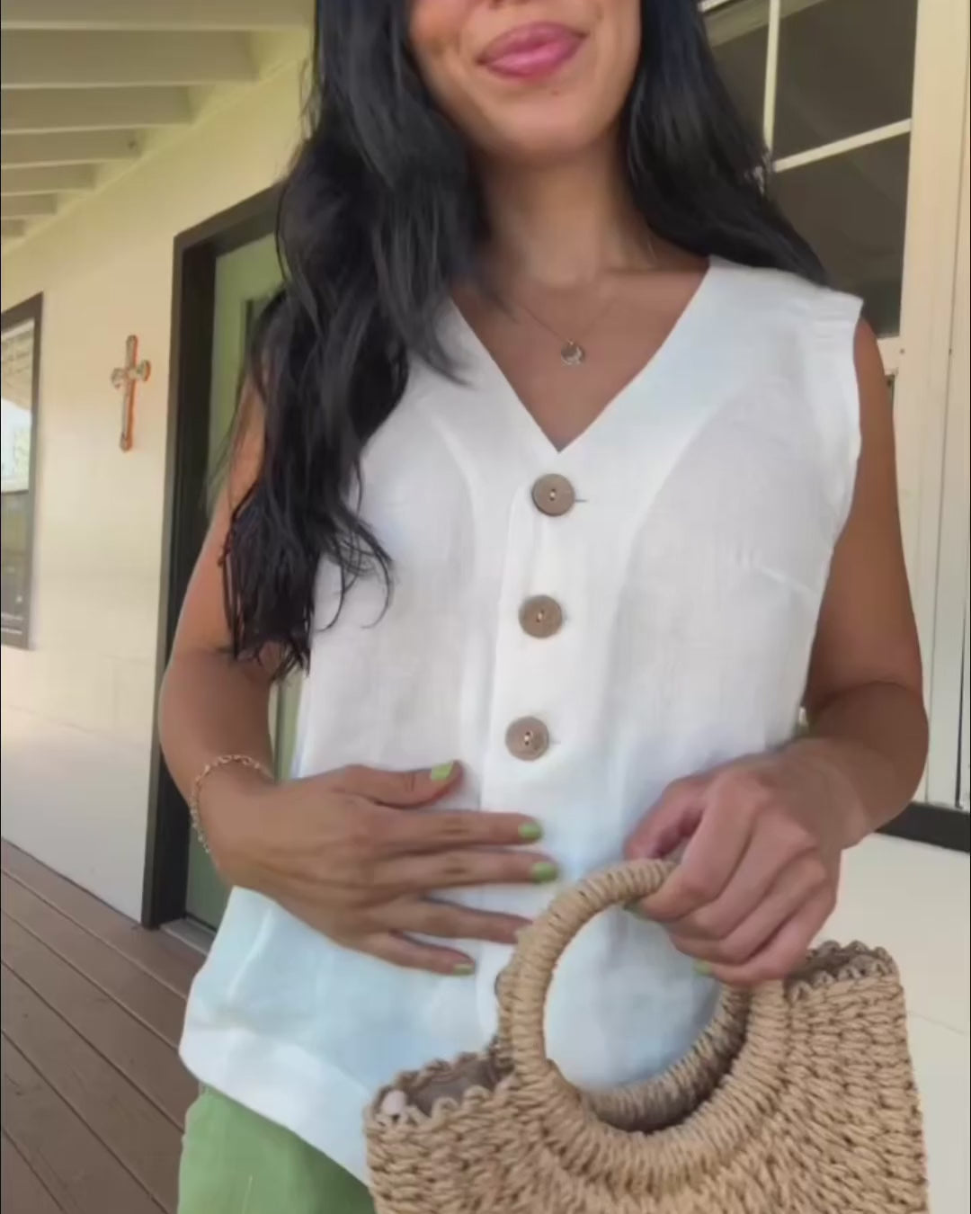 Relaxed linen vest with a clean, minimal silhouette. Designed with a V-neckline and a button-down front, it offers an easy, versatile shape that works well as a layering piece or on its own.