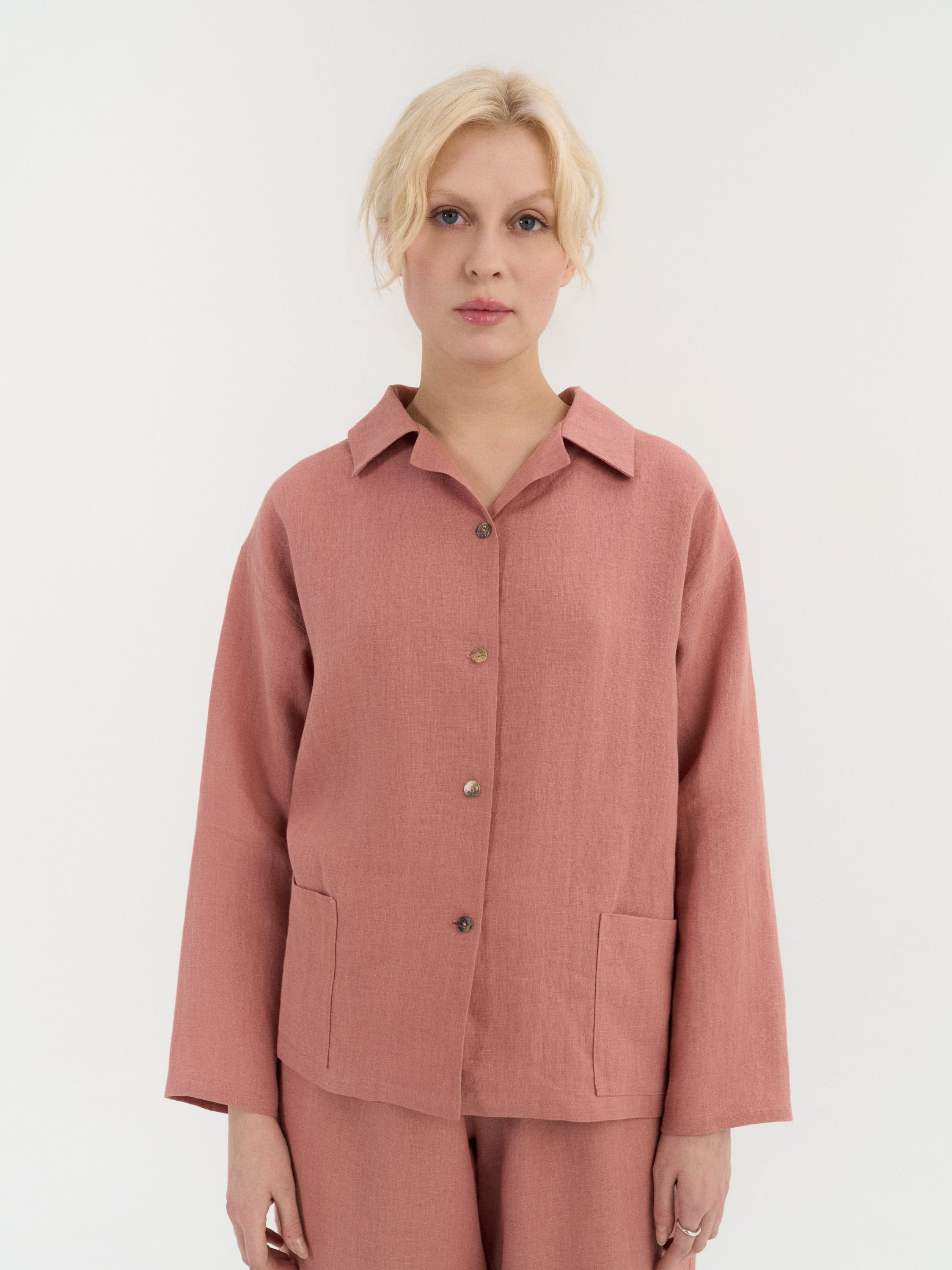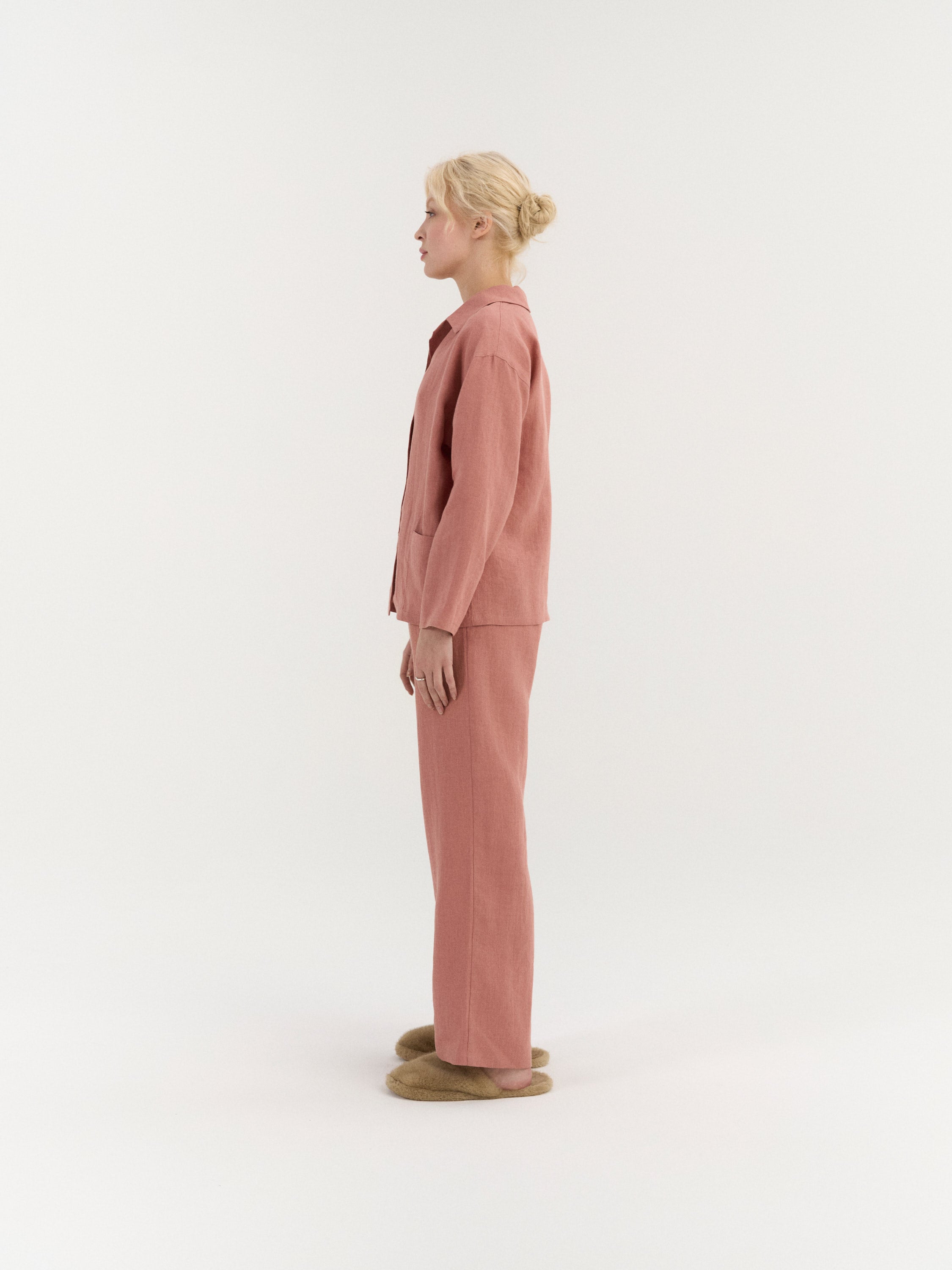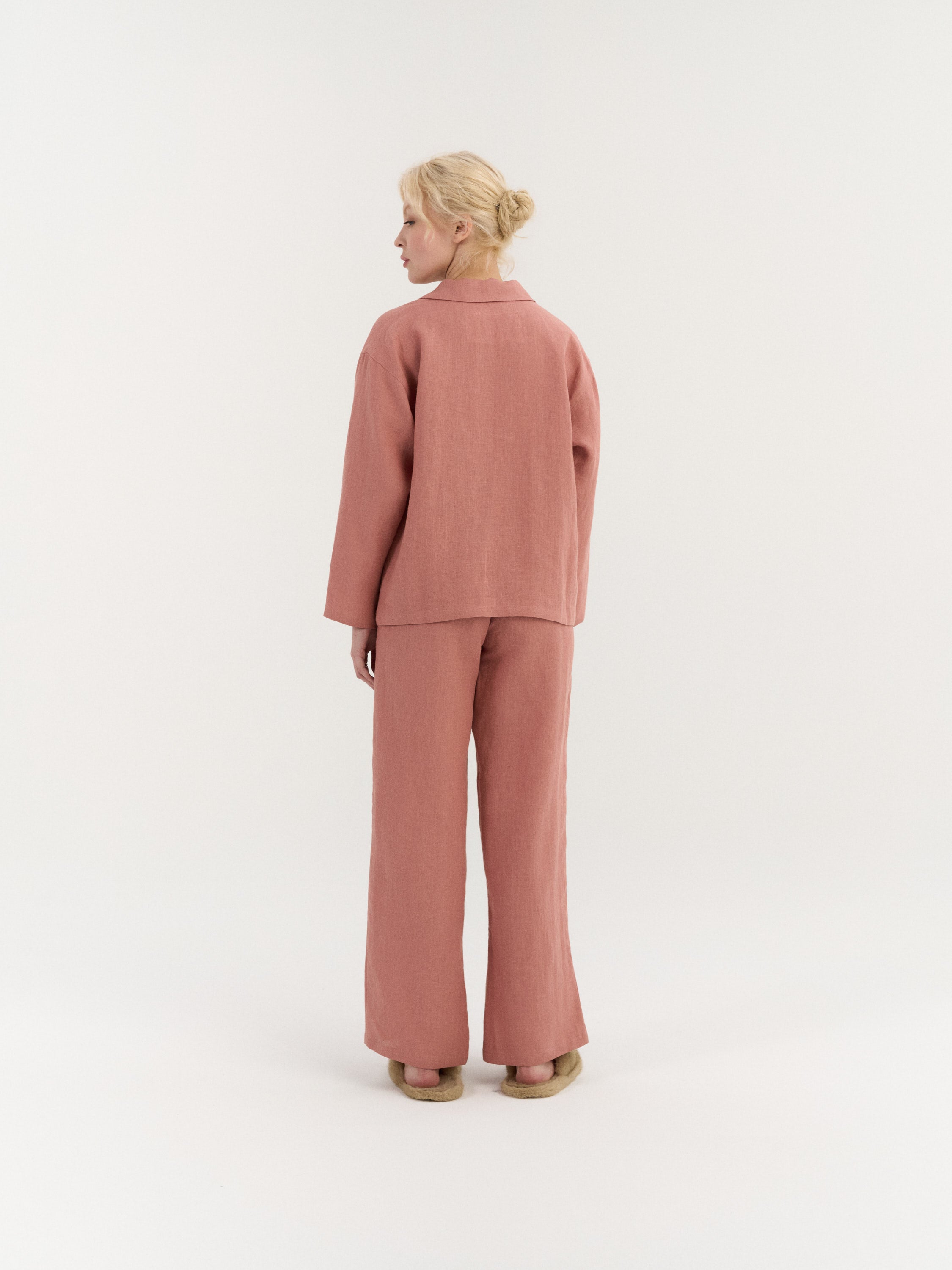 A relaxed two-piece linen pajama set designed for everyday comfort. The shirt features a button-down front with a simple collar and two front pockets, offering a practical, easy-to-wear shape. The matching pants are finished with an elastic waistband and adjustable drawstring, with a smooth, pocket-free design for a clean, uncomplicated fit.
